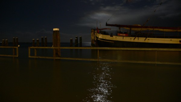 Op donderdagavond wilden we uit eten gaan in het Amsterdams Koffiehuis. Ik stond aan dek, het was tweeëneenhalf uur voor HW. Het water begon al over de steiger te spoelen, ik riep Peter dat hij snel moest zijn. Na het eten was het bijna HW, we gingen even kijken. De hele kade stond onder water, we moesten biertjes drinken tot ruim na middernacht om weer aan boord te kunnen.