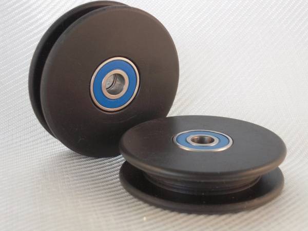 Derde voorbeeld, uit de ligfietswereld ditmaal. Deze kettingrollen zijn voorzien van keramische lagers. Er is op dit moment flinke discussie over de vraag hoeveel winst keramische lagers nu precies opleveren ten opzichte van stalen lagers. Maar ik denk dat voor- en tegenstanders het er toch wel over eens zullen zijn dat de winst in ieder geval minder zal zijn dan het verlies van een ketting die over een rol loopt in plaats van over een tandwiel. Een fietsketting die over een rol loopt, stuitert de hele tijd een klein beetje op en neer. Dat geeft herrie en dat wordt meestal opgelost door een rubberen ring om de rol te spannen. Daar wordt het uiteraard niet beter van, rubber dissipeert flink energie bij het in- en uitveren.