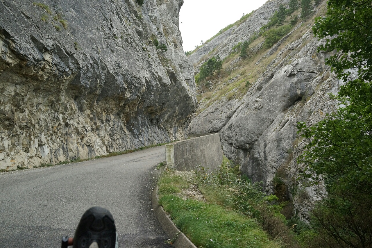 Een grote klim is het niet. Er zit maar één echte col in, en die is iets van 500 meter en nergens steil. Wat hem bijzonder maakt, is dat halverwege de klim een heel smal stuk is. Toen ik er op af reed, vroeg ik me af waar nu precies de deuk in de berg zat, en hoe in hemelsnaam de weg zou kunnen lopen om over die deuk heen te gaan. Het leek alsof er een tunnel moest zitten.