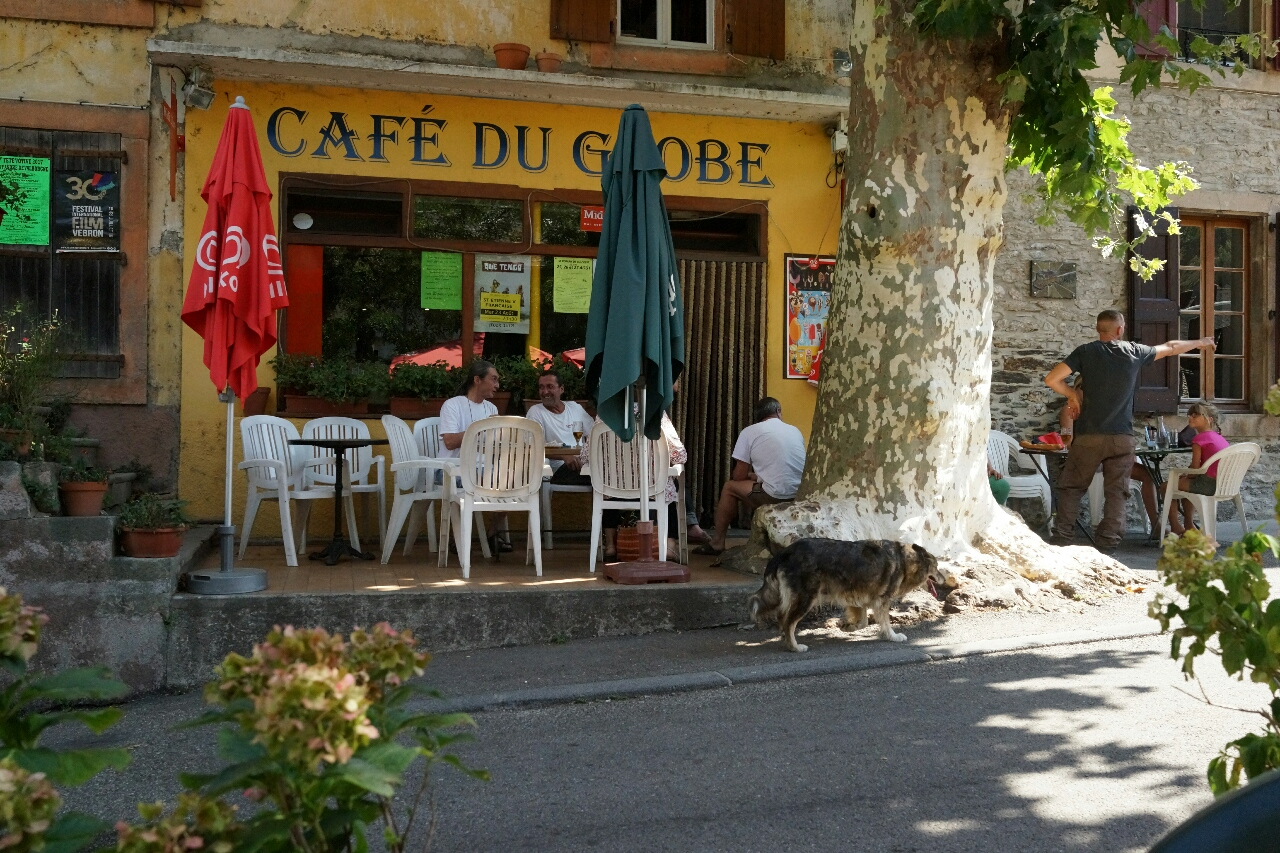 Het is vrij snel duidelijk dat het vlakke stuk in de 100 Cols een uitzondering is. Vrijwel direct nadat ik de camping in Lasalle verlaat, begint het klimmen. Tegen elven heb ik de eerste twee officiële cols al gedaan. Ik ben dan na een lange, moeilijke afdaling gearriveerd in Sainte-Croix-Vallée-Française in de Cevennen. Ik ga zitten bij Café du Globe voor koffie. Het is een mooi oud café, met een miniterrasje voor de gevel, in de schaduw van oude hoge bomen. Een oude hond slentert langs om te zien of er nog wat te schooien valt.