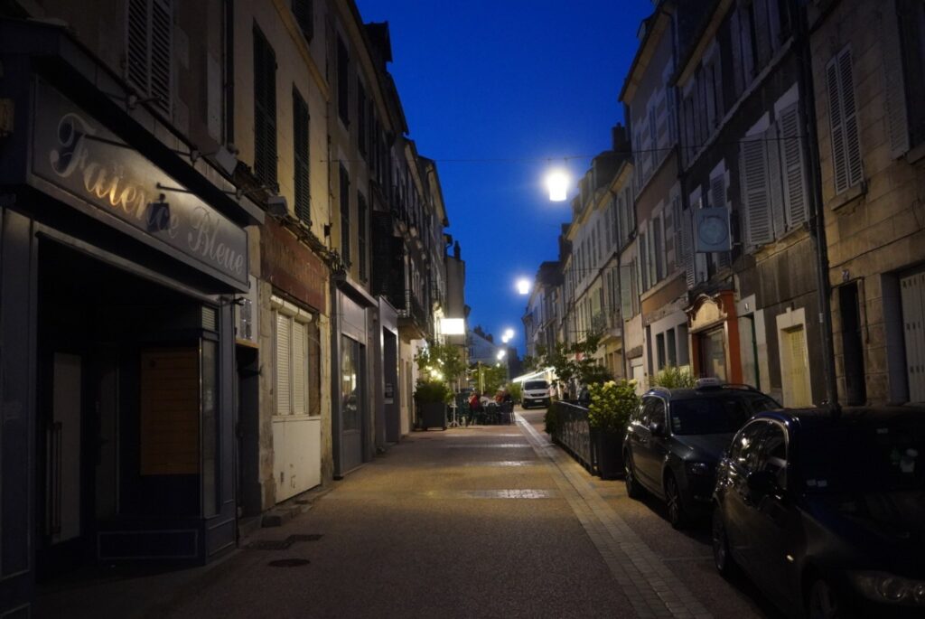 Na kamp gemaakt te hebben en gedoucht, wandel ik over de lange brug naar de stad. Eerst strijk ik neer op het terras van Café Vélo, wat ik natuurlijk aan mijn stand verplicht ben. Hier drink ik een heerlijk lokaal witbier. Een terras verderop hebben twee oude kerels met strohoeden platenspelers geïnstalleerd en beginnen leuke hitjes van vroeger te draaien. Nevers stelt niet teleur.