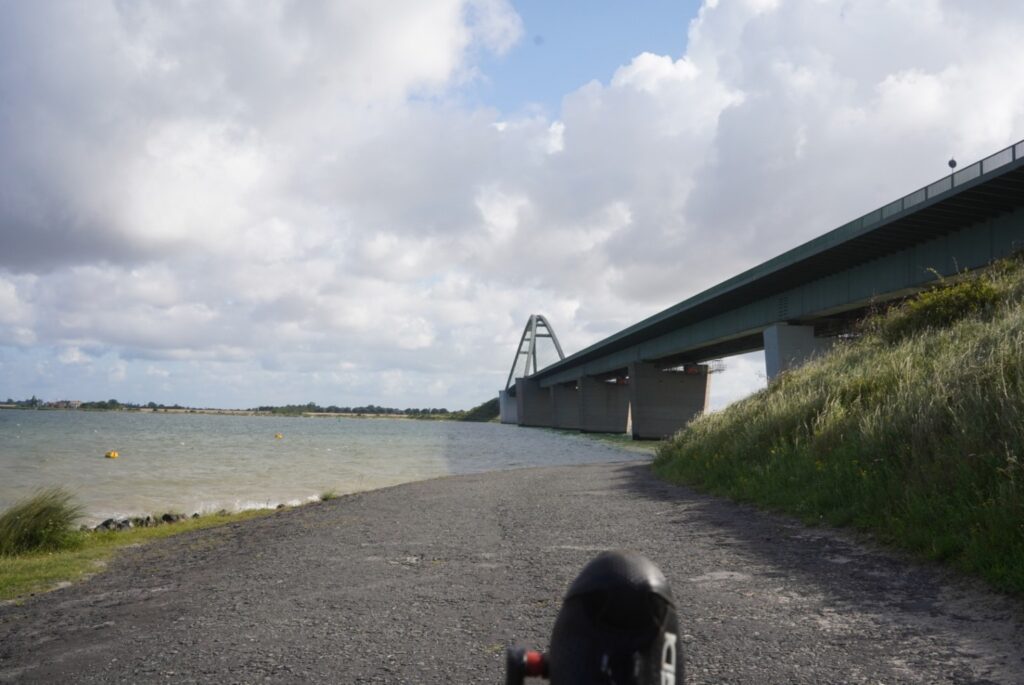 Ik ben al een flink aantal kilometers op weg als ik ontdek hoe verstandig de beslissing was om niet door te trekken tot op Fehmarn. Ik volg mijn route op de GPS, maar kom naast de brug terecht in plaats van er op. Het is me volstrekt onduidelijk hoe ik omhoog moet. Misschien moet ik toch gewoon aan de rechterkant zijn? Ik fiets om het bruggenhoofd heen over een gravelweg, onder de hoofdweg naar Fehmarn door. Maar ook daar is geen opgang.