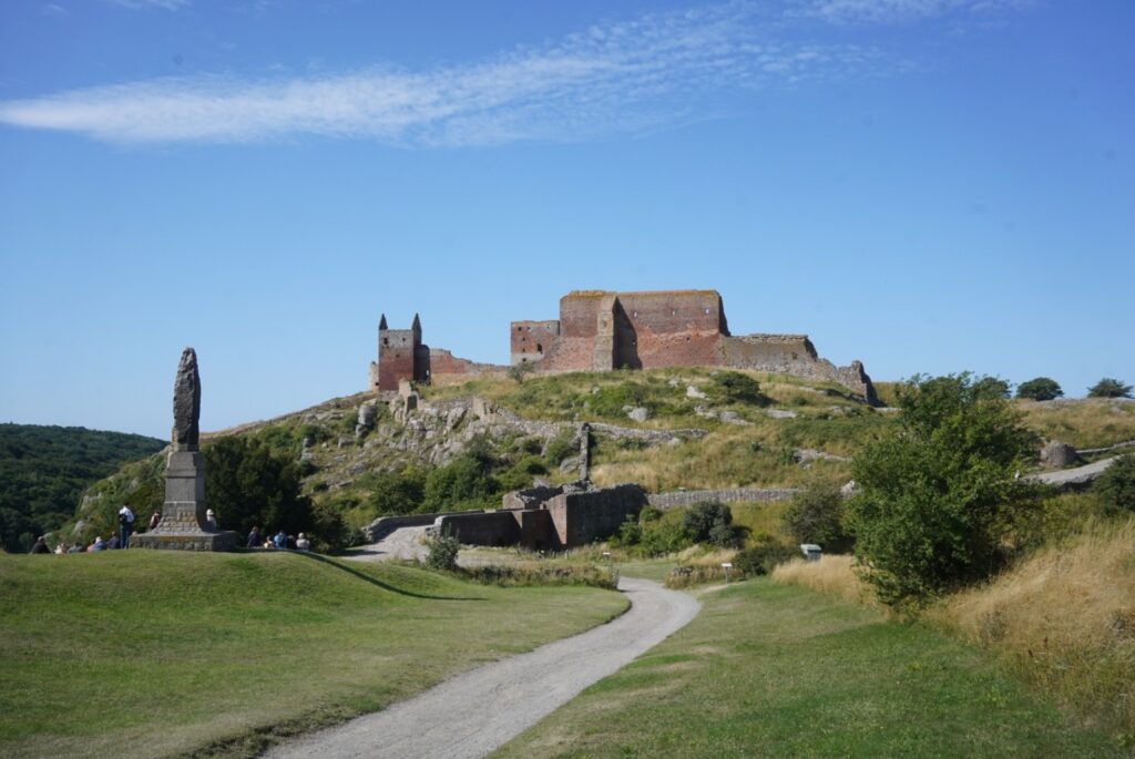 Koffie drinken aan de kust lukt niet. Te vroeg. Bij de noordpunt van het eiland is mijn route anders, waardoor ik dit keer vlak langs Hammershus kom. Ik stap even af en loop naar de voet van de burcht, maar ik zie het niet zitten om op mijn fietsschoenen over de kinderkopjes naar boven te lopen. Vlakbij staat een gids in middeleeuws kostuum een groep toeristen toe te spreken.