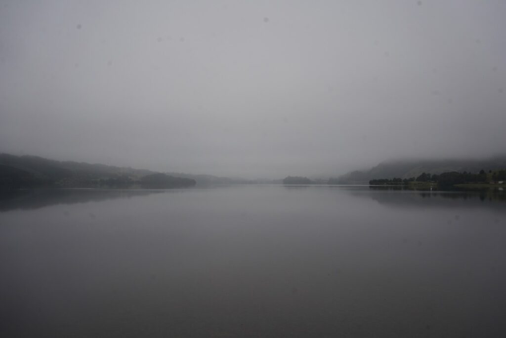 De bergen waren ingeklemd tussen het massieve water van de meren en de zee, en het zwevende water van de wolken. De strakblauwe lucht van gisteren had plaatsgemaakt voor dikke, laaghangende wolken met daaronder een soort dunne nevel die net geen miezer werd. En het was stil.