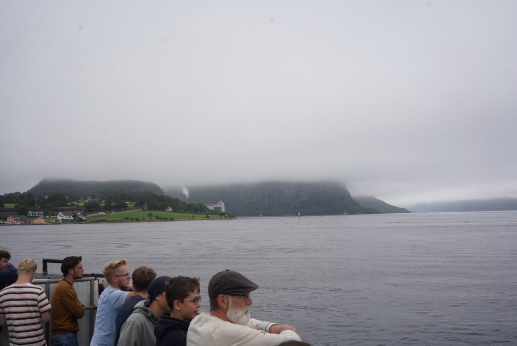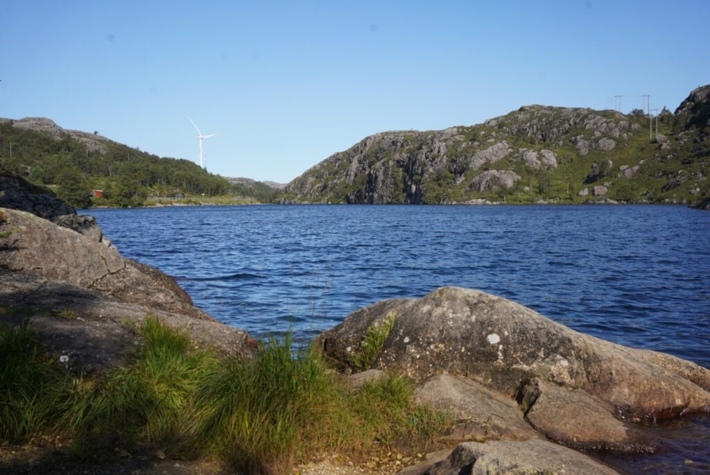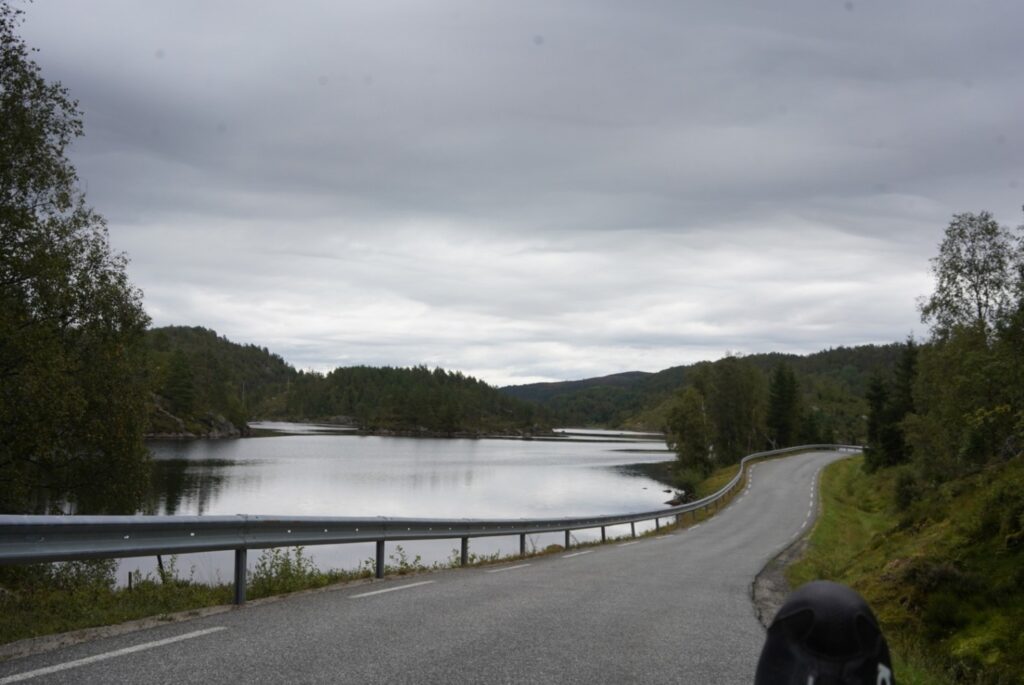 Over een kleine weg fiets ik om het langwerpige meer heen richting het fjord. Soms twijfel ik of de zwevende druppels in miezer zijn veranderd, maar het geringste klimmetje maakt mijn lichaam al te warm voor een regenjas. Net zuid van Tau kom ik op de hoofdweg, die iets verder langs het fjord verandert in een kleinere weg, aangezien de hoofdstroom van het verkeer een enorme tunnel induikt richting Stavanger.