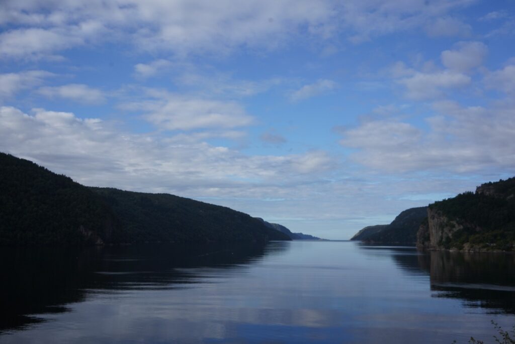 Wanneer ik bij het fjord arriveer, stop ik even om achterom te kijken. Tussen de bergen door, naar open zee. In het ochtendlicht. Het is het mooiste uitzicht van de reis.