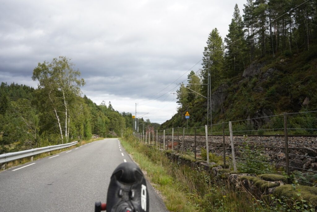 In de middag gaat de route voor een groot deel langs de Sørlandsbanen, de spoorlijn die Oslo en Stavanger verbindt via Kristiansand. Maar ook dat is zelden vlak. Deze lijn gaat door eindeloze tunnels en over hoge spoordijken. Vanaf de weg begrijp je snel waarom. Het is ondertussen grauw maar rustig weer geworden, alsof er een beetje herfst in de lucht zit. De route gaat door bossen, langs kleine meren en moerassen.