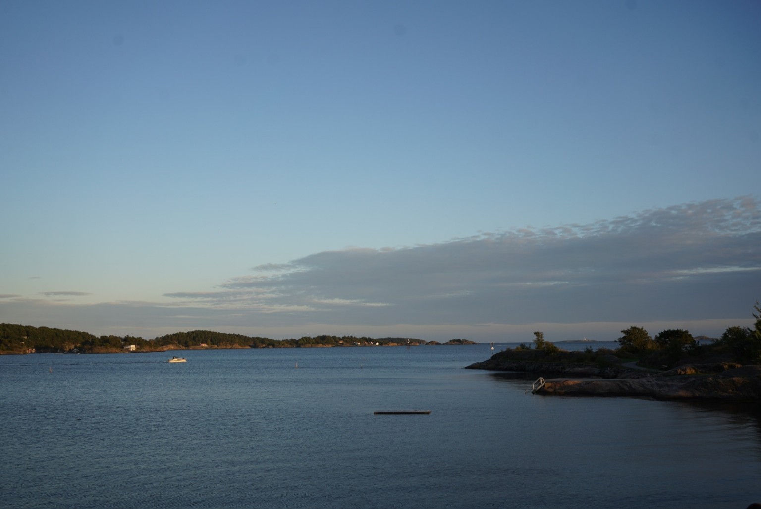 Na het eten wandel ik een rondje om de sfeer op te snuiven, maar koffie drink ik in de keuken van de camping. Nog even loop ik naar de jachthaven om vanaf een openluchttribune over de zee uit te kijken. Het is helder en rustig. De zon gaat onder.